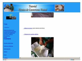 Hemos elaborado un tutorial “Técnica de Cateterismo Vesical” en lenguaje HTML, soportado en disco compacto, que tiene 106 imágenes inéditas, tanto sobre la técnica, como de los procedimientos afines. El software permite al estudiante visualizar cada paso de los procederes y comprobar su conocimiento a través de la autoevaluación. El mismo consta de: